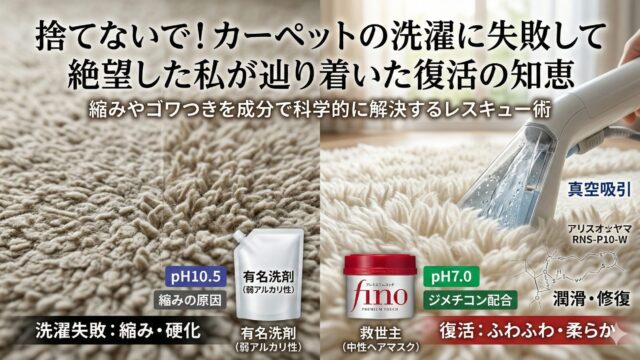 カーペットを洗濯して失敗し、カチカチに縮んだ絶望を抱えていませんか?私も同じ経験をしたからこそ辿り着いた、科学的な再生術があります。ヘアマスクの成分で繊維を潤し、リンサーで汚れを抜く。そんな具体的な解決策をまとめました。カーペットの洗濯失敗をリセットして、あの日以上の愛着を取り戻しましょう!
