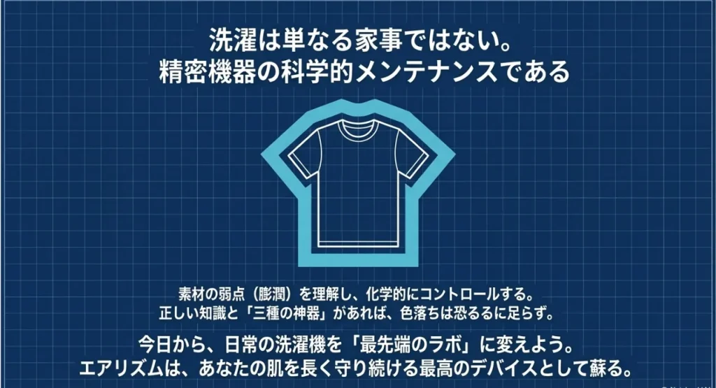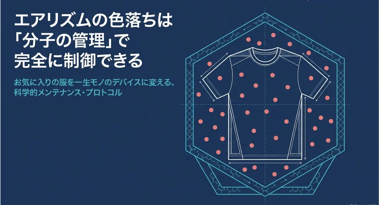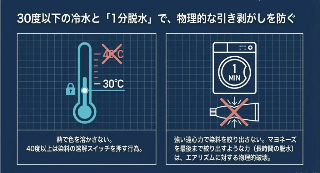 エアリズム特有の「水でふやける繊維」を化学的に引き締め、温度を30度以下に保つことで、染料が外へ逃げ出すルートを物理的に遮断できます。