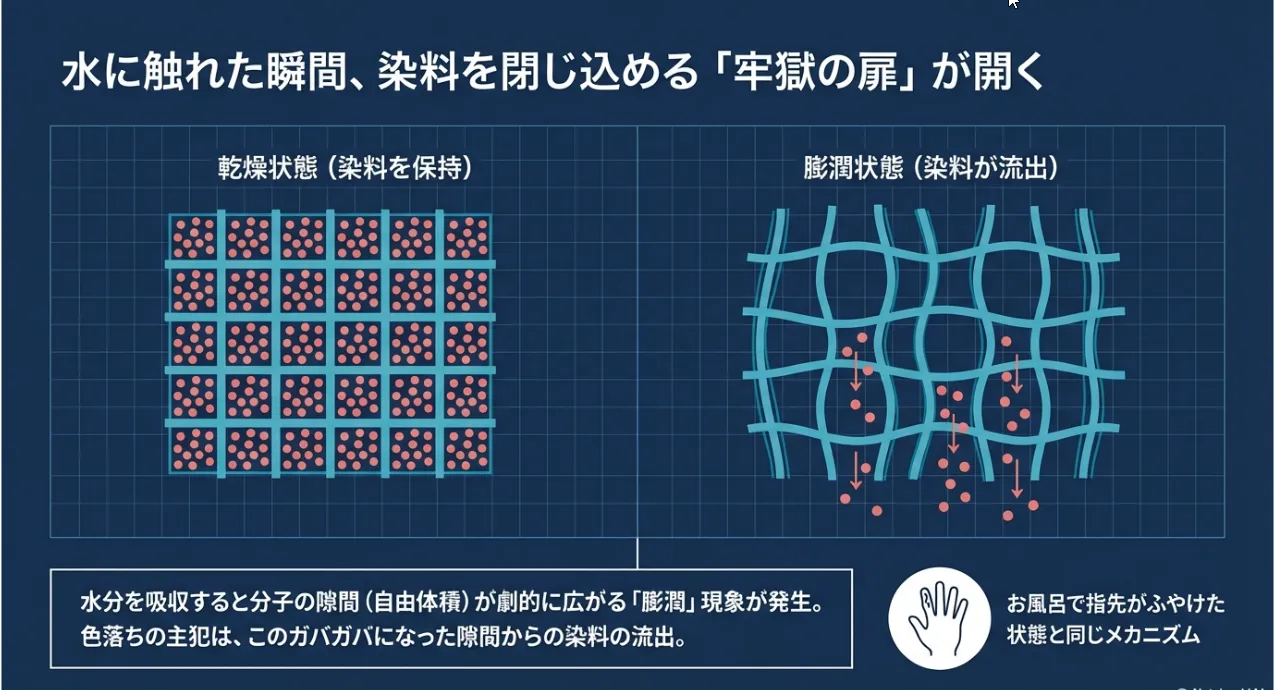 水を吸って「ゲル状」になる繊維の隙間から色が逃げる理由