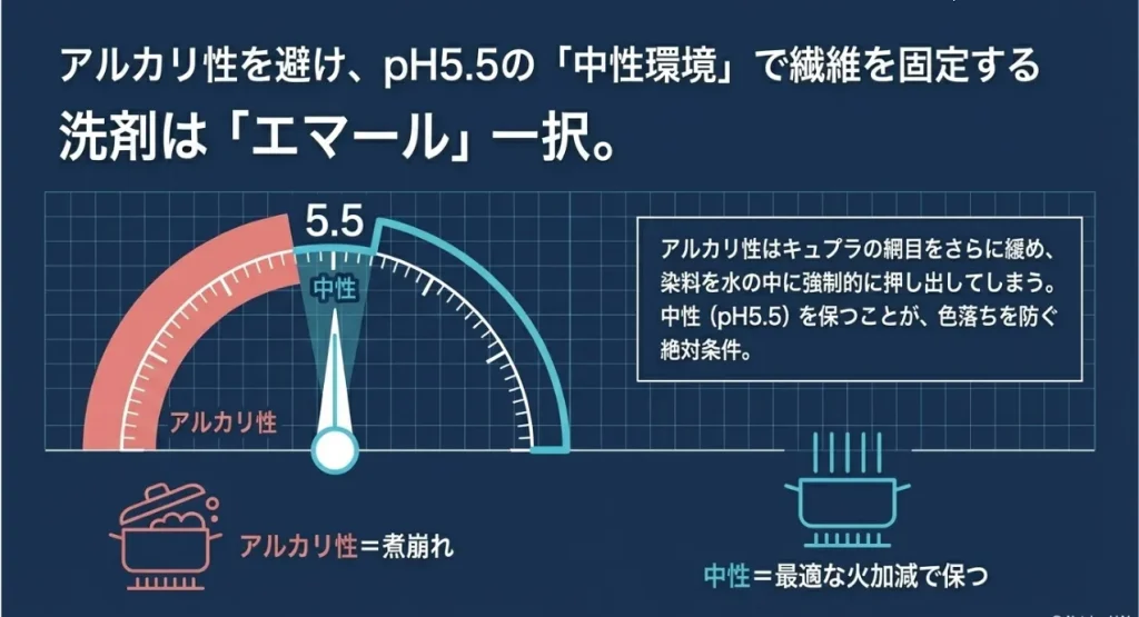 料理で言えば、煮崩れを防ぐために火加減を調節するのと同じ。pH5.5〜7.0あたりの中性を保つことで、繊維の構造をシャキッと保ち、色を内部にしっかりとどめておくことができます。