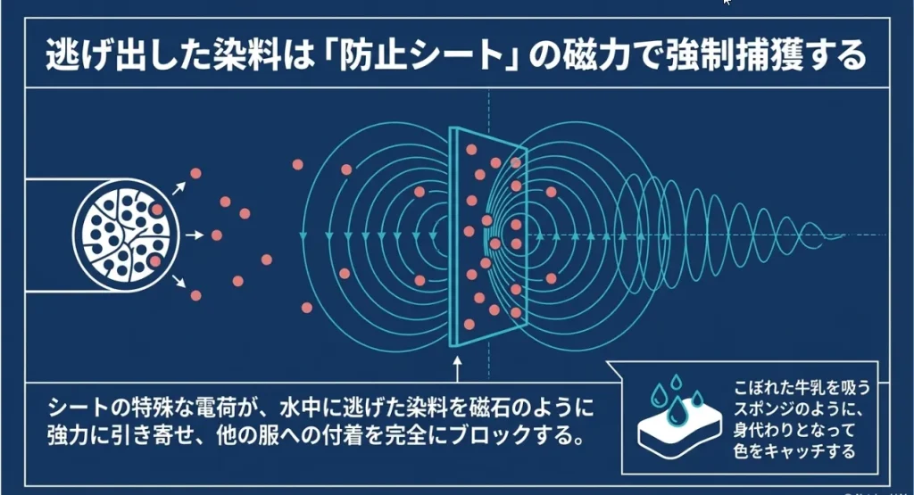 そこで活躍するのが、「色移り防止シート」です。このシートは、水の中に溶け出した染料を、繊維に再吸着する前にキャッチしてくれる優れもの。いわば「染料の身代わり」になってくれるんです。