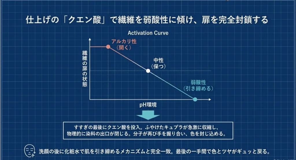 洗濯が終わったばかりの衣類は、洗剤の影響でわずかにアルカリ側に傾いていることがあります。ここですすぎの最後にクエン酸を投入すると、繊維のpHが弱酸性に戻ります。これを「中和」と言いますが、この瞬間にキュプラの膨らみが収まり、繊維がぎゅっと縮まって、染料の出口を物理的に封鎖してくれるんです。