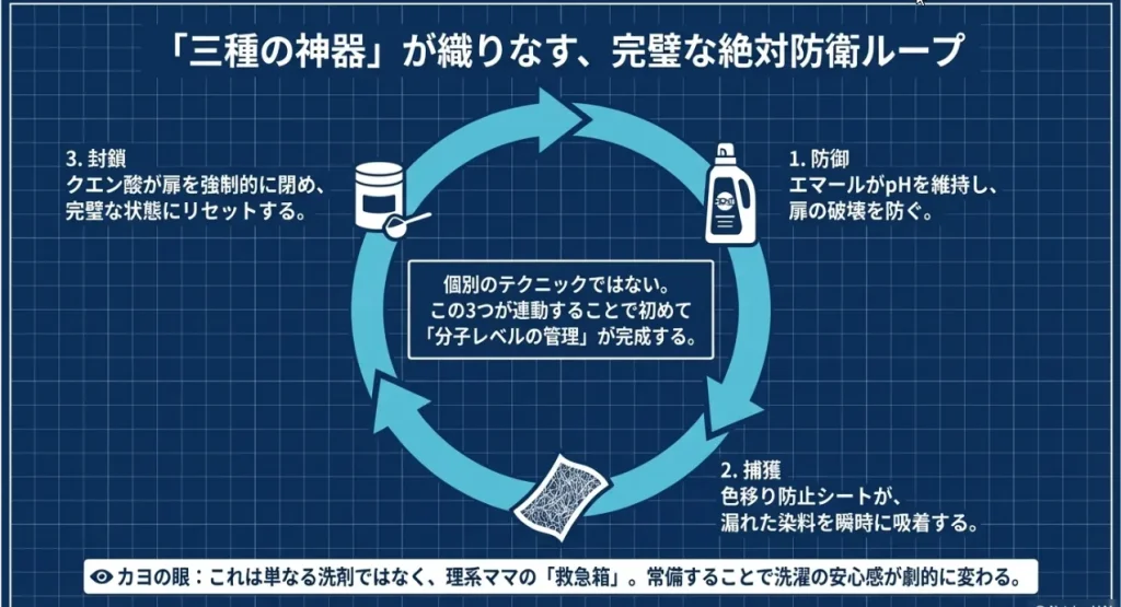 | 【守りの防御】 | ドクターベックマン 色移り防止シート | 水中に逃げ出した染料を、磁石のように吸着して再付着を防ぎます。 |