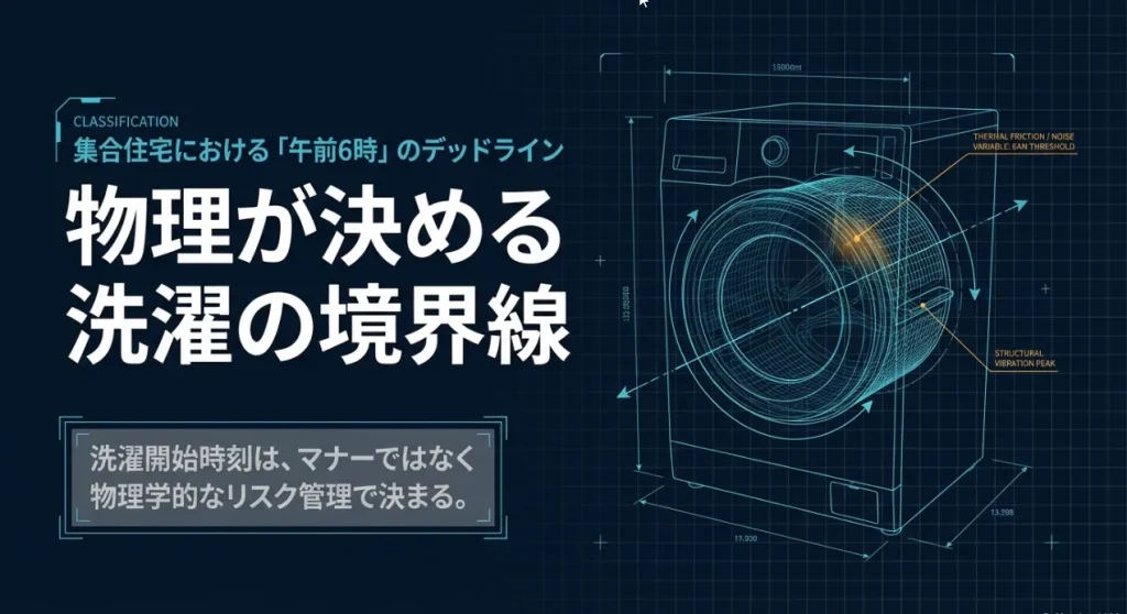 集合住宅での洗濯時間は、単なる「マナー」や「思いやり」の問題として語られがちですが、実はこれ、明確な「物理学」で答えが出る問題なんです。なぜ同じ音量でも、朝だけは特別に響いてしまうのか。その理由は、明け方の空気の温度や、建物の壁を伝わる目に見えない振動の波に隠されています。