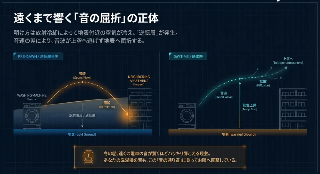 「昼間は気にならないのに、なぜ朝だけ洗濯機の音が遠くまで響くの?」と思ったことはありませんか? 実はこれ、明け方の空気の状態が「音を地面に向かって曲げている」からなんです。