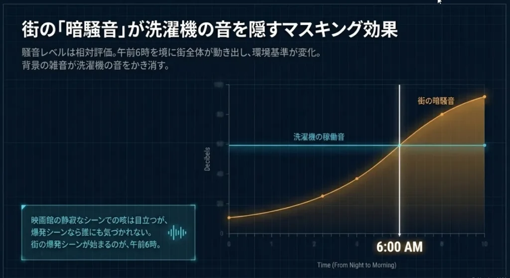 午前5時台はまだ街全体が眠りに落ちていて、背景の雑音(暗騒音)が30デジベル(dB)程度まで下がっています。ここに70dB近い脱水音が鳴り響けば、どんなに対策をしても目立ってしまいます。しかし、午前6時を過ぎると、車の走行音や他のお家の給排水音が立ち上がり、街の雑音は50dBを超えてきます。この「社会の雑音」がカーテンのような役割を果たし、あなたの洗濯機の音を包み込んで隠してくれるのです。