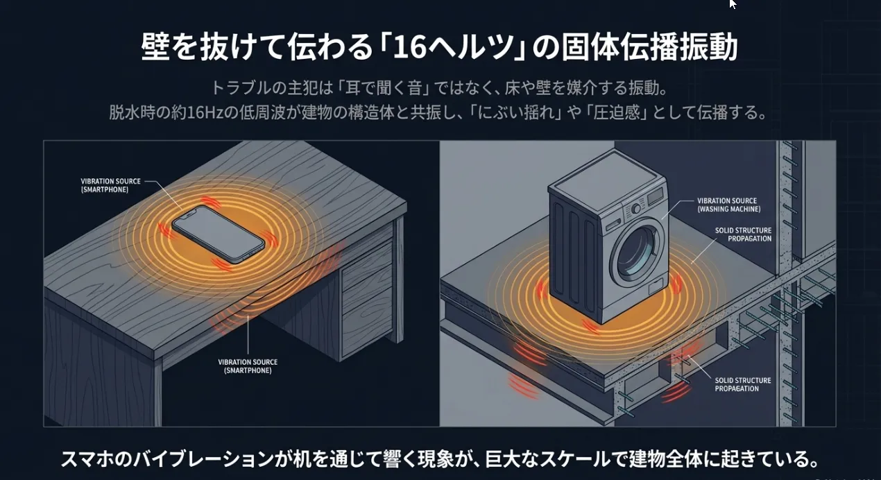騒音問題の本当の正体は、窓から漏れる音よりも、床を伝わってくる「振動」にあります。特に全自動洗濯機が脱水に入る際、1秒間に16回ほど細かく揺れる低周波の振動(16Hz)が発生します。これが集合住宅の構造体と「共振」すると、想像以上の音量でお隣に響いてしまうのです。