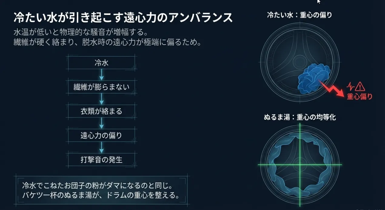 綿(コットン)などの天然繊維は、水を含むとふっくら膨らむ性質があります。でも、水温が低いと水分子の動きが鈍くなり、繊維の奥まで水が入り込みにくくなります。すると、衣類の一部は水を吸って重くなり、一部は乾いたままで軽いという「重さのムラ」が生まれます。この状態で高速回転する脱水が始まると、洗濯槽の中で激しい遠心力の偏りが発生し、「ガタガタガタ!」というあの恐ろしい打撃音を招いてしまうのです。