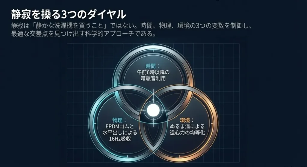 午前6時を境に環境基準が変わり、街の「暗騒音」が洗濯機の音を隠してくれます。適切な防振対策を組み合わせれば、この時間が科学的な「静寂の境界線」になります。