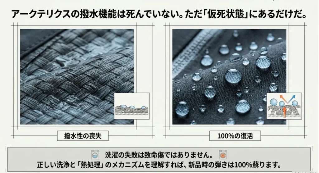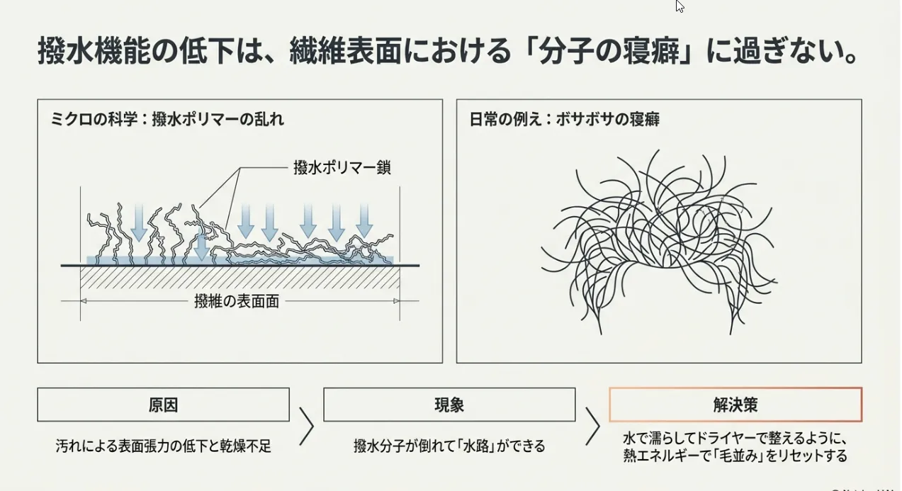 撥水性が消えるのは汚れや洗剤残りが原因。熱を与えて分子を整列させ、余計な成分を徹底的に洗い流せば、新品時の輝きが戻りますよ。