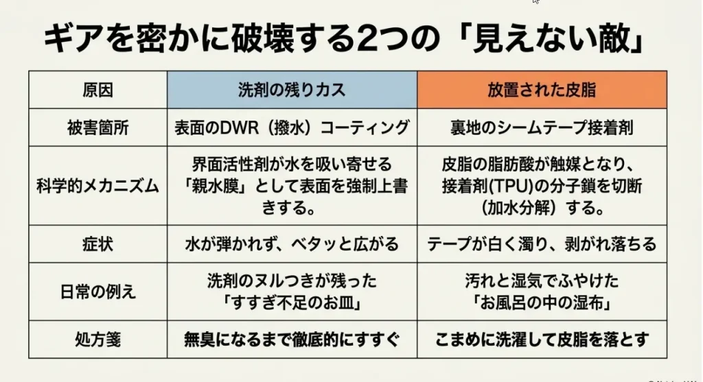 「しっかり洗ったはずなのに、むしろ水が染み込むようになった」という失敗。これ、実は「洗剤の落としすぎ」ではなく「洗剤の残り」が原因であることがほとんどです。