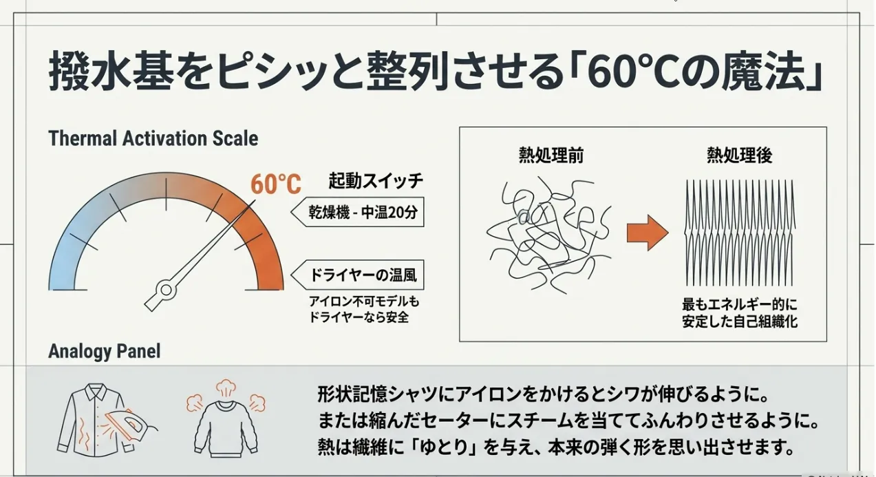 撥水復活の正解は乾燥機の「熱」!倒れた分子を整列させる技術
