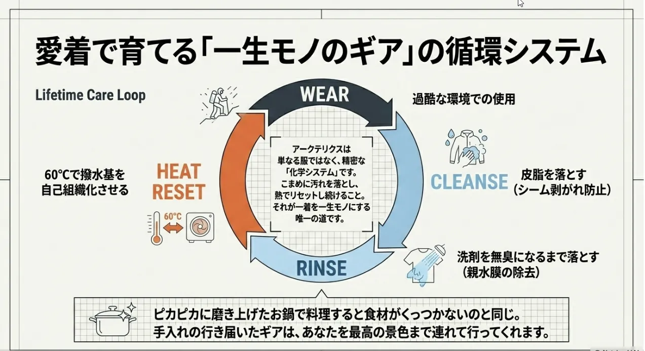 アークテリクスは、過酷な環境からあなたを守ってくれる最高の相棒。正しいケアでその輝きを保ち続けて、また次の素晴らしい景色を一緒に見に行ってくださいね。私も福井の曇り空の下、あなたの大切な一着が蘇るのを応援しています!