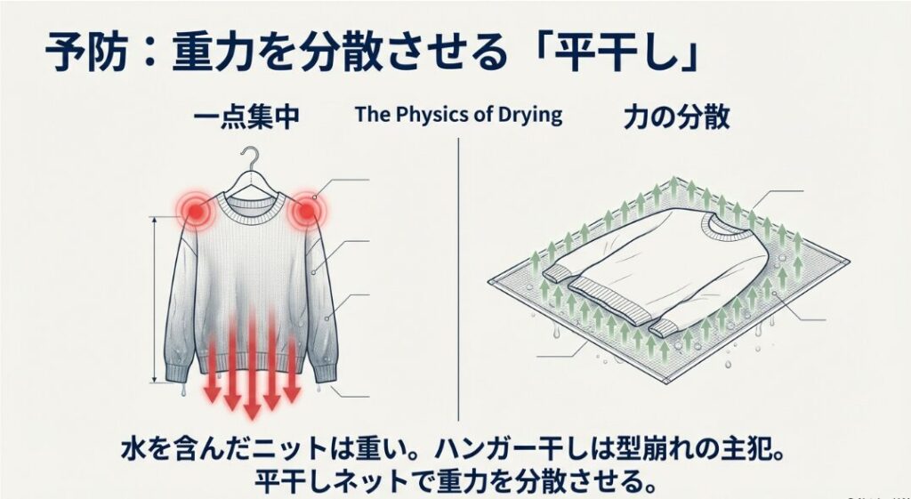 せっかくスチームやトリートメントで形を戻しても、最後の「乾燥」で手を抜くと全てが台無しになります。ニットの洗濯失敗の8割は、実は干し方にあると言っても過言ではありません。キーワードは「重力の分散」。水を含んだニットの重さは想像以上で、ハンガーに吊るした瞬間に肩の部分に全重量が集中し、縦に伸びる力が働き続けます。