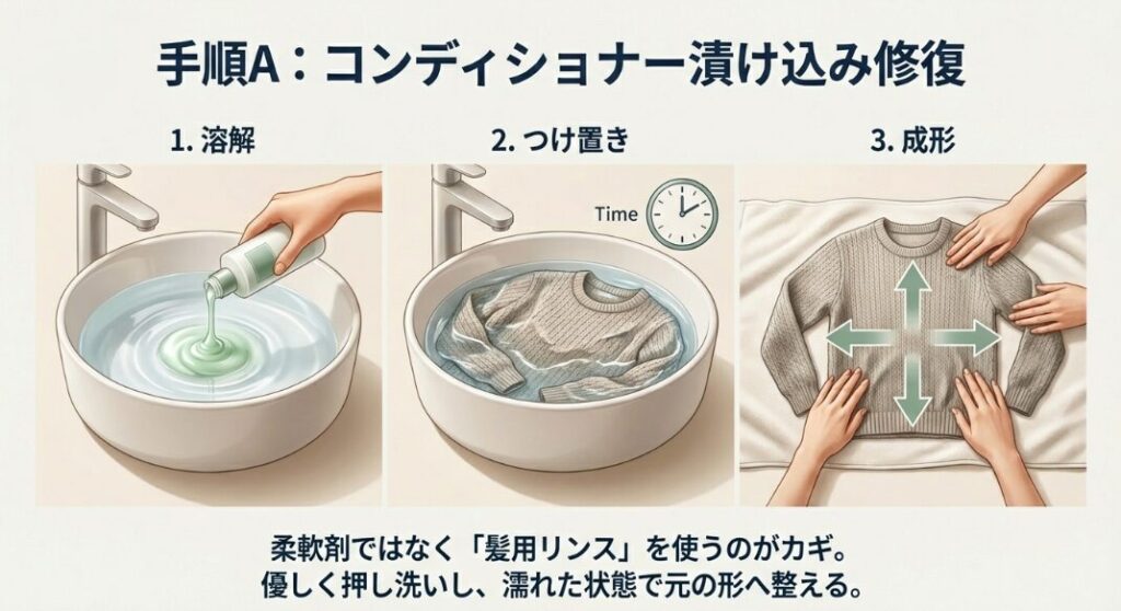 使い方は簡単です。洗面器にぬるま湯を張り、トリートメントをワンプッシュ溶かします。そこにカーディガンを浸し、優しく押し洗いをするだけ。トリートメントに含まれる「ジメチコン(シリコン)」や陽イオン界面活性剤が、繊維の表面(スケール)を滑らかに整えます。これにより、摩擦でがんじがらめになっていた編み目が柔軟性を取り戻し、手で優しく引っ張ることで、元の寸法へスムーズに戻るようになります。まさに、衣類にコンディショナーを塗るような感覚ですね。