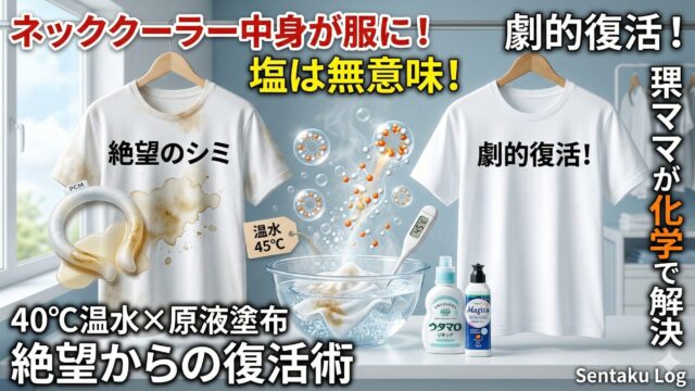 ネッククーラーの中身が服についた!と焦っている方へ。実は塩は無意味。PCMの正体は油です。理系ママが、45度のお湯と洗剤で油を乳化させ、繊維の奥から汚れを根こそぎ落とす科学的な復元術を伝授します。ネッククーラーの中身が服についても、この方法ならお気に入りの一着を確実に救えます。