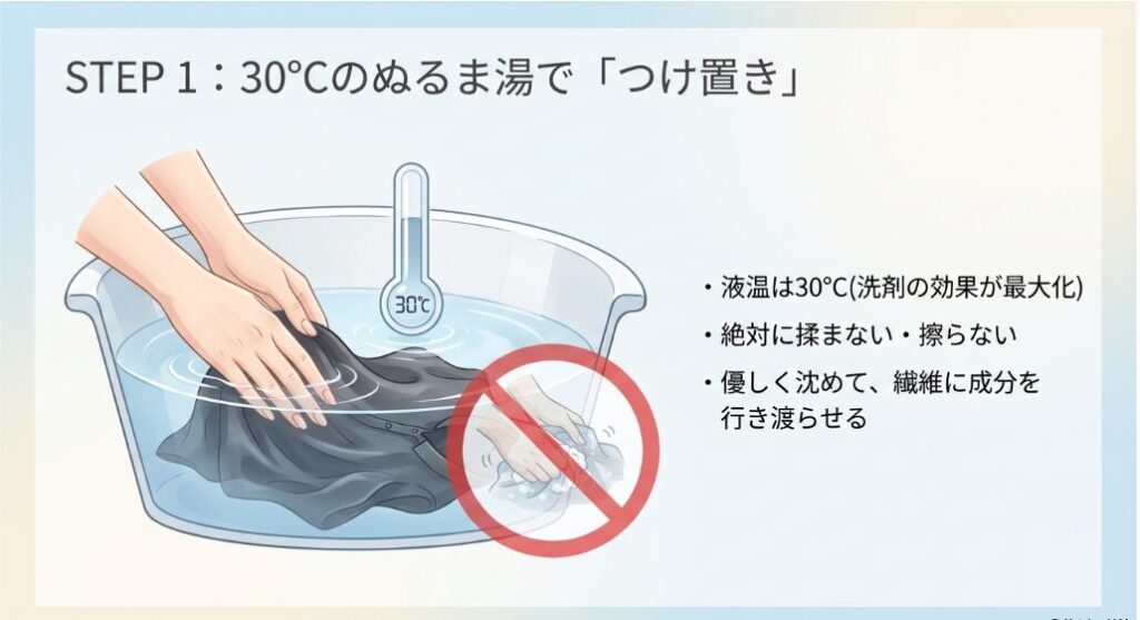 まずは洗面器に30度のぬるま湯を張り、規定量のプロ・ウォッシュを溶かします。ここに縮んでしまったキュプラの服を沈め、優しく押し洗いをしながら5分間浸け置きします。ここで高濃度のアミノ酸ポリマーが繊維をコーティングし、安全に水分を含ませる(再膨潤)準備を整えます。