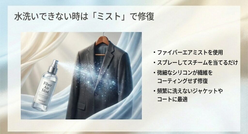 CMでよく見る大手メーカーの中性洗剤は、あくまで「汚れを優しく落とす」のがメイン。 キュプラのような繊細な素材には、洗うと同時に繊維をアミノ酸ポリマーで保護してくれるプロ用洗剤が必要です。 また、普通の霧吹きは粒が大きすぎて「輪ジミ」の原因になりますが、超微細なミストなら、繊維の芯まで優しく潤してシワを解いてくれますよ。