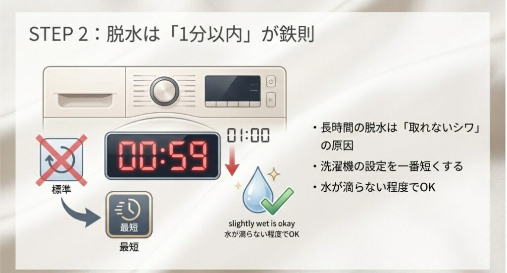 キュプラの洗濯で最も怖いのが脱水時のシワです。水から引き上げたら軽く手で押して水分を切り、洗濯ネットへ。洗濯機での脱水は「わずか10〜15秒」でストップしてください!水滴がポタポタ落ちない程度になれば十分です。これ以上回すと、遠心力で修復不能なシワが刻まれてしまいます。