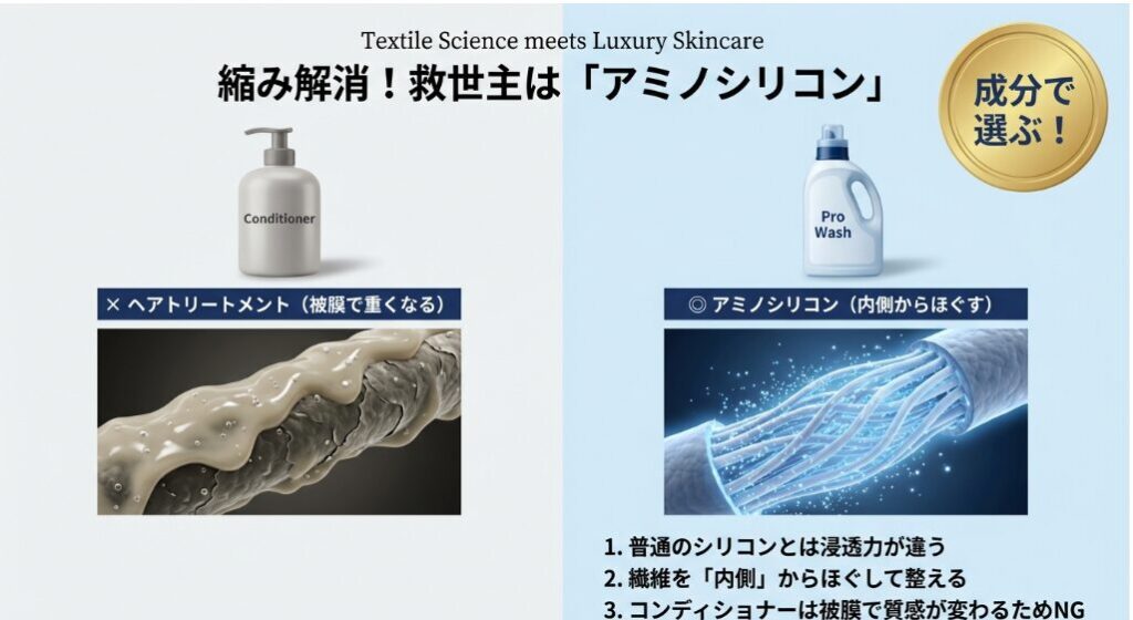 (代用コンディショナーとは異なり、衣類専用のアミノ酸ポリマーが繊維の奥まで浸透。縮んだ繊維を「再膨潤」させるパワーが圧倒的です)