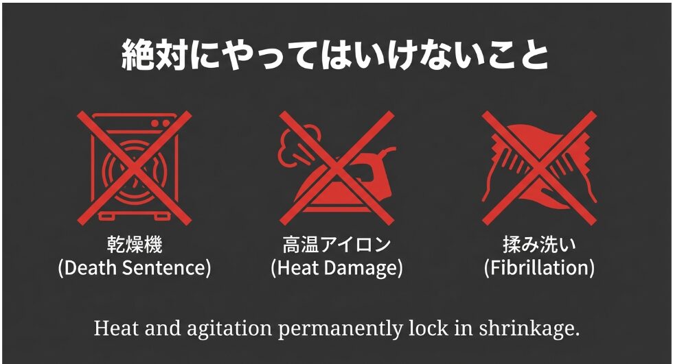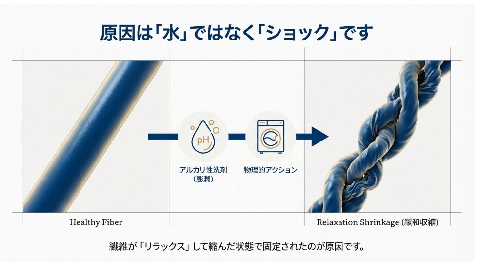 • 失敗の正体:天然素材特有の「膨潤」と、アルカリ洗剤が招く「水素結合」の解除。