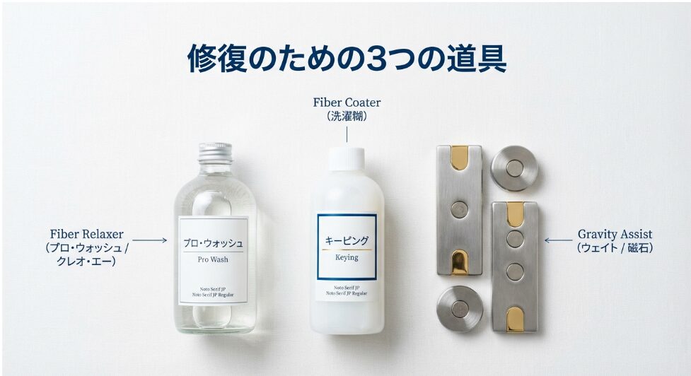 • 救世主アイテム:繊維を滑らせるプロ用洗剤と、戻した形を維持する「仕上げ樹脂」。