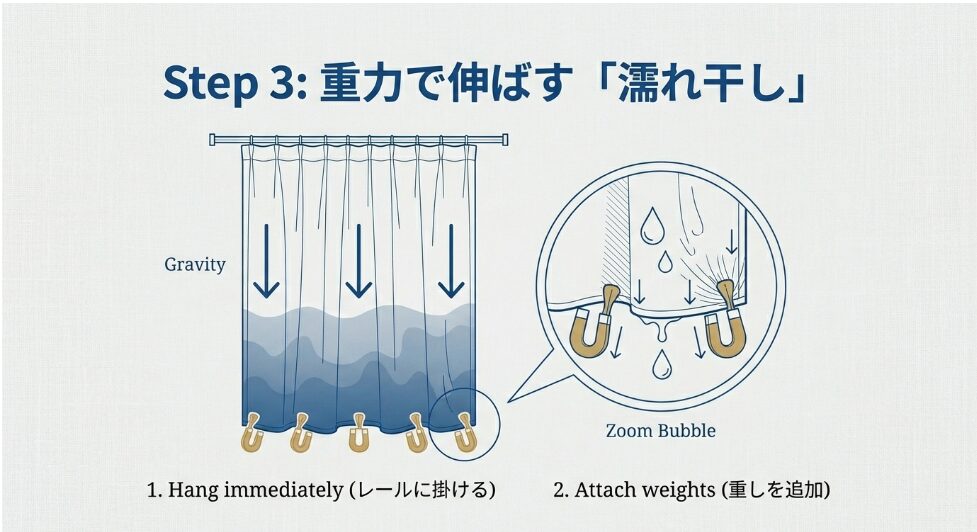 すすぎ後、洗濯機での脱水は「回転が安定してから30秒以内」で止めてください。少し水が滴るくらいがベスト。なぜなら、水分を含んだカーテンは乾いている時の3〜5倍の重さになるからです。この数キロの「天然アイロン」を味方にするのが、レスキューの核心です。