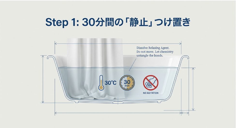 まず、カーテンを縦に細長く「屏風畳み」にします。この時、一番デリケートな「芯地(上部)」を内側に巻き込むのが型崩れを防ぐコツです。浴槽に30℃のぬるま湯を張り、プロ・ウォッシュと「仕上げ剤」を溶かし、30分間浸け置きします。ポリマーと樹脂が繊維の奥まで浸透し、ガチガチの結合を解いてくれます。