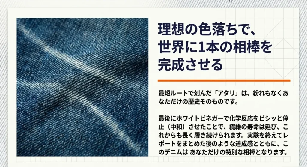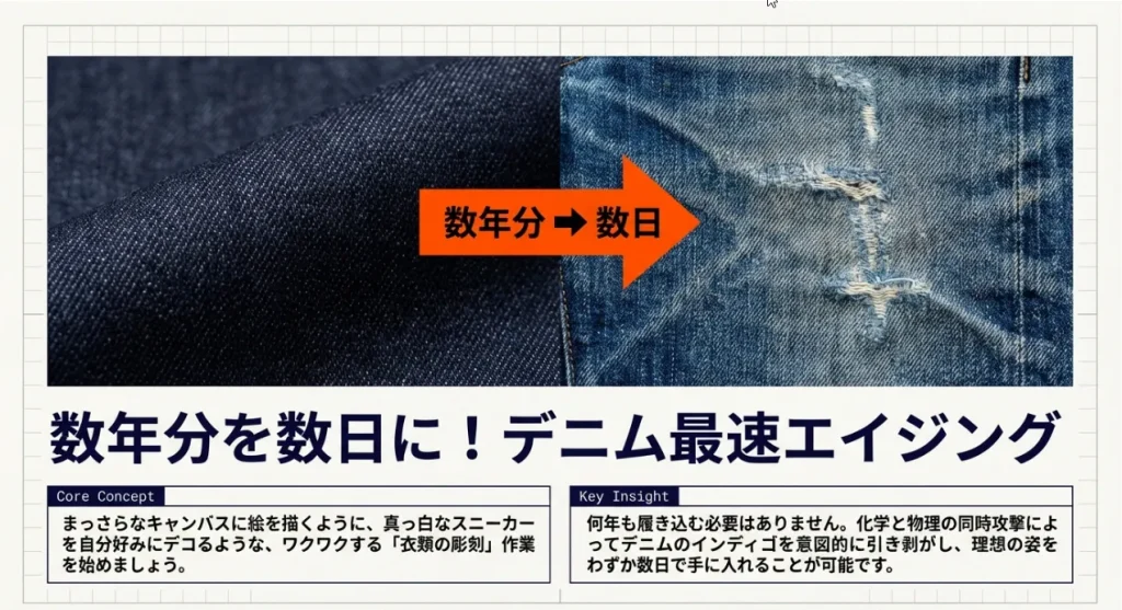 デニムを早く色落ちさせることは、単に服を古くすることではありません。それは、本来なら数年かかる「あなたの身体の動き」という歴史を、科学の力を借りて濃縮して刻み込む、最高にクリエイティブな作業なんです。