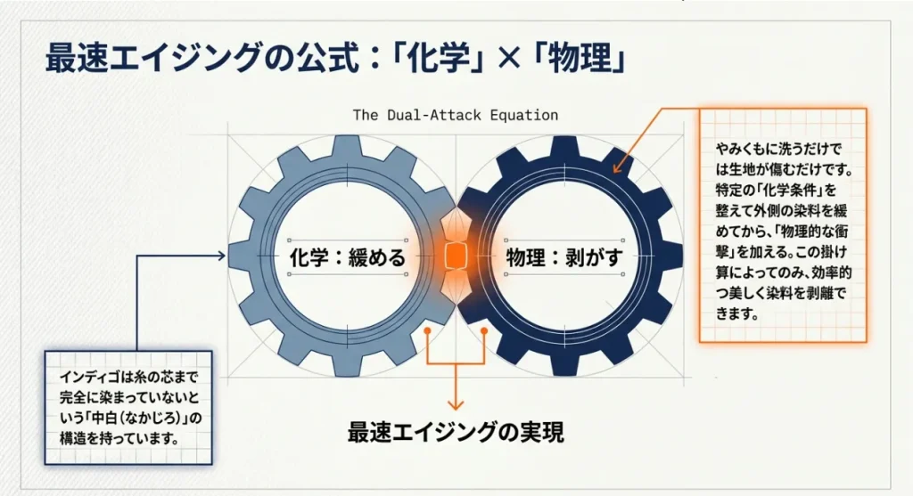 デニムを早く色落ちさせる、つまり「エイジング」させるというのは、科学的に言えば「インディゴ染料を酸化させて剥がす」ことと「繊維を物理的に削る」ことの掛け算です。インディゴ染料は糸の芯まで染まっていない「中白(なかしろ)」という構造をしているので、表面のわずか数ミクロンをいかに効率よく引き剥がすかが勝負になります。