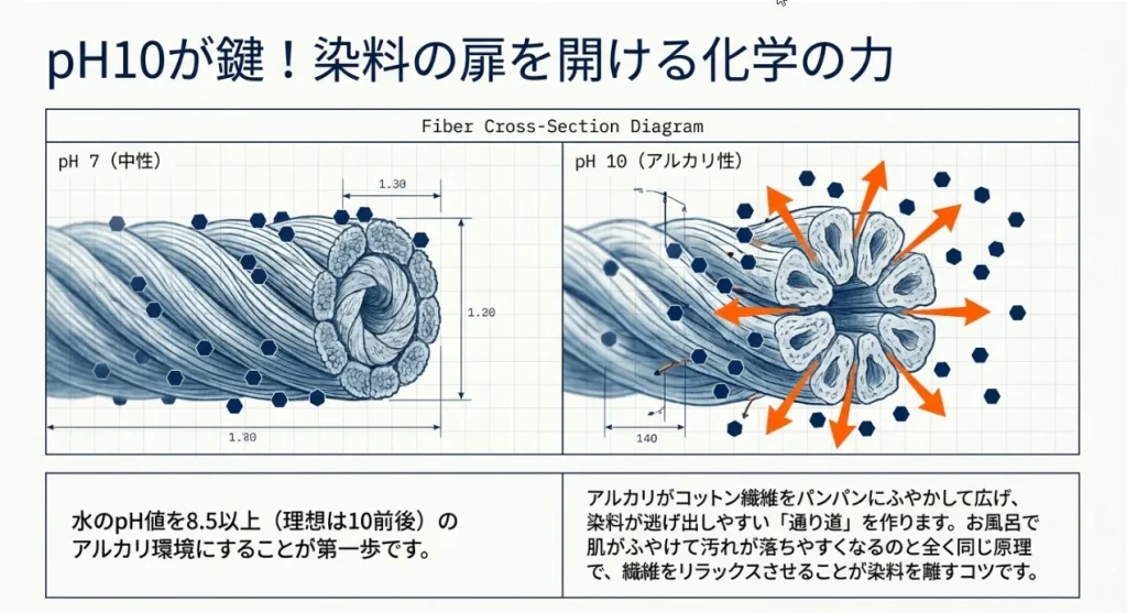 特にpH10.0から10.5程度のアルカリ環境を作ると、コットン繊維が水分を吸ってパンパンに膨らみます(ふやけた状態)。このとき繊維の隙間が広がるため、物理的な摩擦による染料の脱落効率が劇的に向上するんです。実験データによれば、この環境下での洗濯は、弱酸性で行う場合に比べて色が移動する力が約3.8倍も跳ね上がることが分かっています。まずは「アルカリ性に傾けること」が、エイジングの扉を開ける第一歩になりますよ。