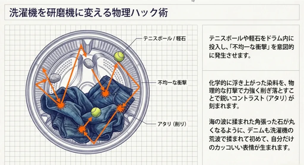 化学の力でインディゴ染料を浮かび上がらせたら、次は物理的な力でそれを「削り落とす」番です。デニム特有の鋭いシワ、いわゆる「アタリ」を作るには、洗濯機の中を意図的に過酷な環境に変えてあげる必要があります。