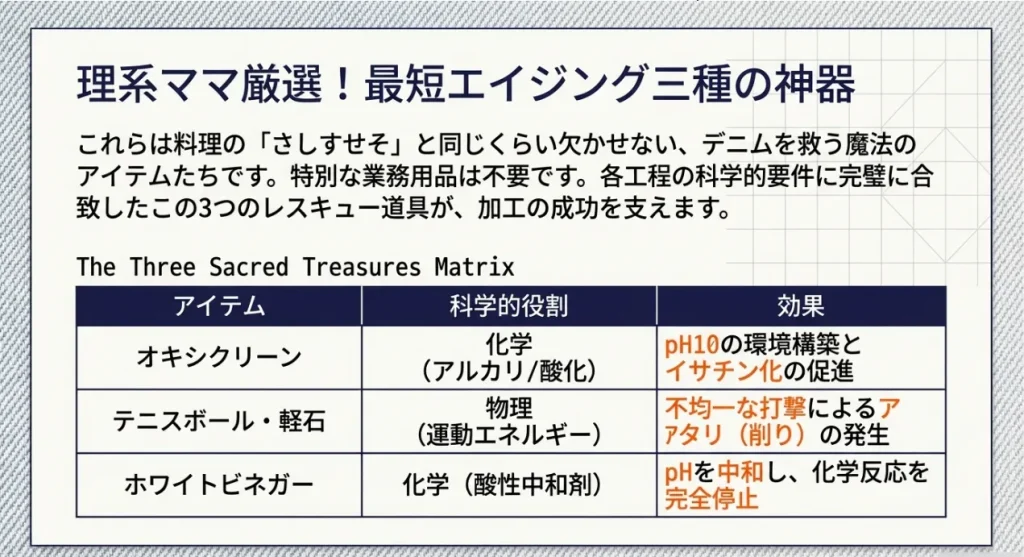 最短で理想の色落ちを掴むために、私が愛用している「化学と物理の相棒たち」をまとめました。用途に合わせて使い分けてみてください。