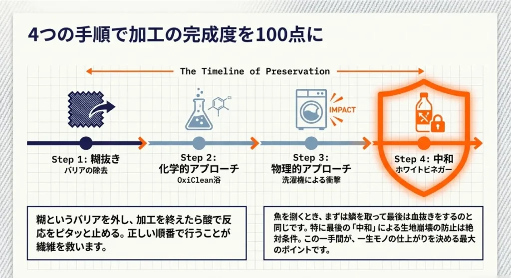 最短で結果を出したいなら、この「化学」と「物理」のスイッチを同時にオンにするのが正解。染料が繊維から離れやすくなる「条件」を整えてあげてから、物理的な衝撃を加える。この同期こそが、工場でのヴィンテージ加工でも行われている本質的なテクニックなんですよ。手間を惜しまず理詰めで進めれば、週末の数日だけでも驚くほどの変化が生まれます。