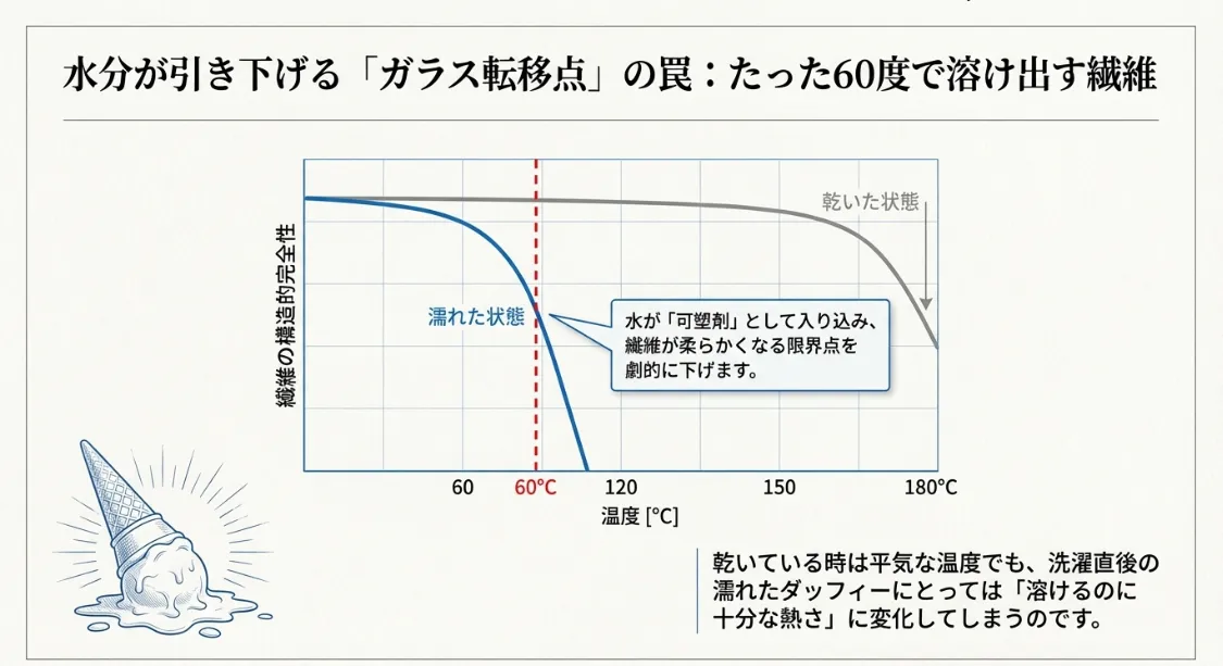 「でも、乾燥機の温度ってそこまで高くないでしょ?」と思うかもしれませんね。ここで重要になるのが、繊維が柔らかくなり始める「ガラス転移点」という温度です。難しい言葉ですが、アイスが溶け始める温度のようなものだと考えてください。