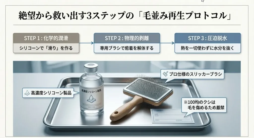 熱で溶け固まった毛先は、専用ブラシと「潤滑剤」を使って一本ずつ剥がすのが唯一の救済策。二度と失敗しない乾かし方も伝授します!