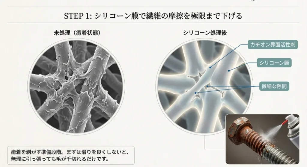 ここで活躍するのが、意外にも「ヘアマスク」や「柔軟剤」です。これらにはシリコーンなどの成分が含まれており、繊維の表面をコーティングして摩擦を劇的に下げる「潤滑油」のような役割を果たしてくれます。