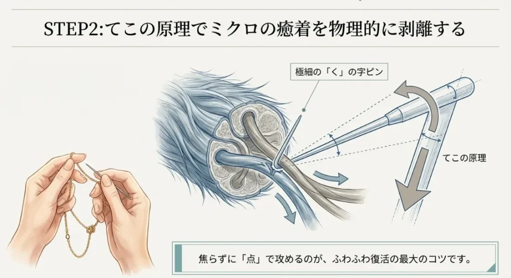 「チリチリになったらハサミで切るしかない」……なんて諦めないでください。熱で繊維同士がくっついてしまった状態でも、完全に炭化(焦げ)していなければ、化学の力で「剥がす」ことができるかもしれません。