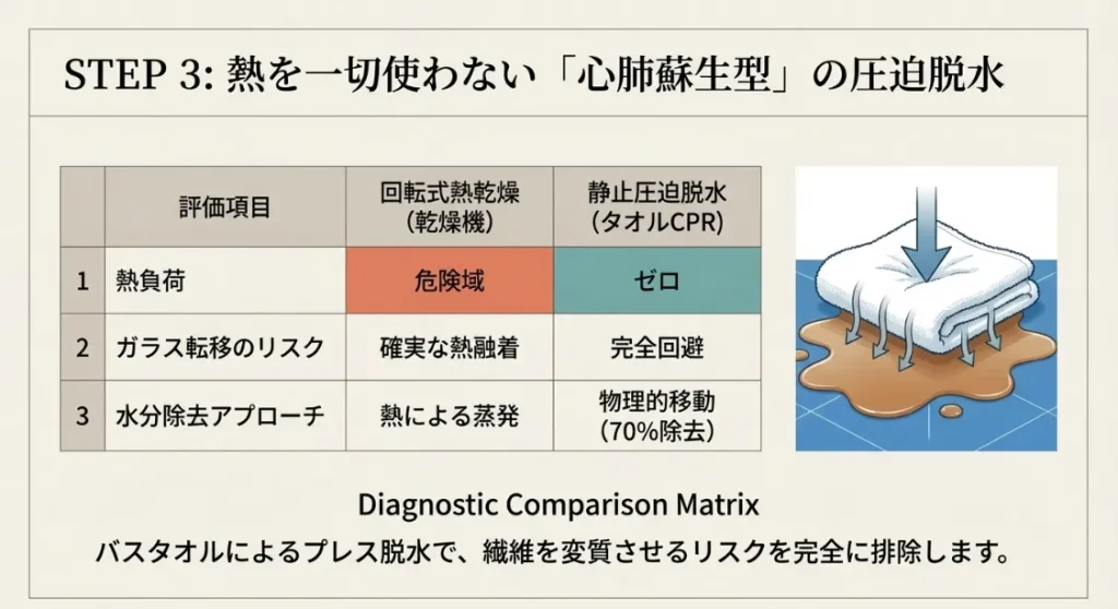 火傷から救い出したあとは、二度と熱によるダメージを与えない乾燥が必須です。私が推奨するのは、乾燥機でもドライヤーでもない、タオルの吸水力だけで乾かす「心肺蘇生型脱水」です。