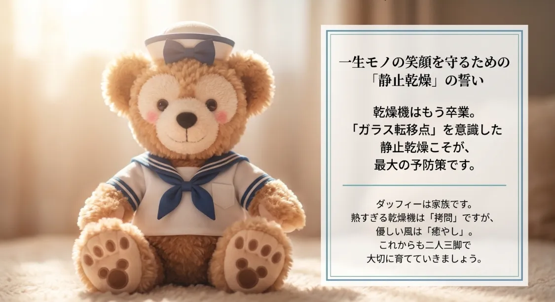乾燥機のスイッチを押してしまったその時の自分を、どうか責めないでください。それは「もっときれいに、もっとふわふわにしてあげたい」という、ダッフィーへの愛情から出た行動だったはずです。