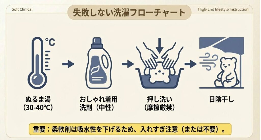 私のこだわりとしては、すすぎの最後に少量のクエン酸(またはお酢)を入れるのがおすすめです。石鹸カスなどのアルカリ性を中和してくれるので、乾いた時の手触りがさらに一段階アップしますよ。こうした「ひと手間」が、失敗したダッフィーを救う大きな鍵になります。なお、使用する薬剤については、事前に目立たない場所で試すなど、自己責任で行ってくださいね。