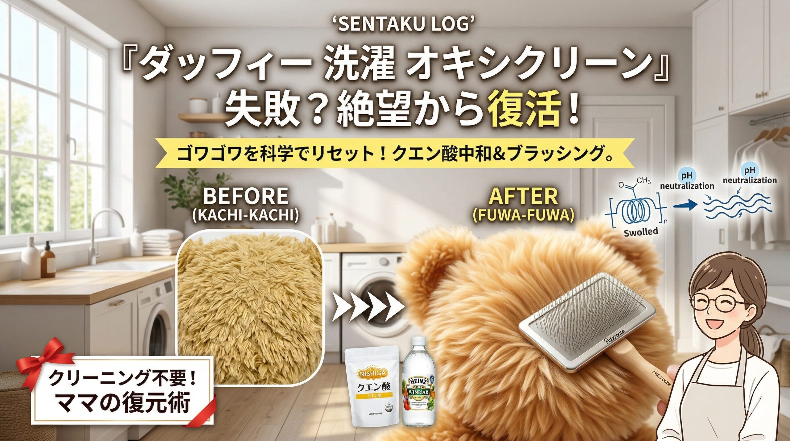 良かれと思って使ったオキシクリーンが、実は毛並みを硬化させる「アルカリ残留」を招いているケースがあります。もし今、あなたのダッフィーがカチカチなら、酸とアルカリの化学反応を利用した中和工程が必要です。再び指が通るフワフワ感を取り戻すための、理にかなった復元術を伝授します!