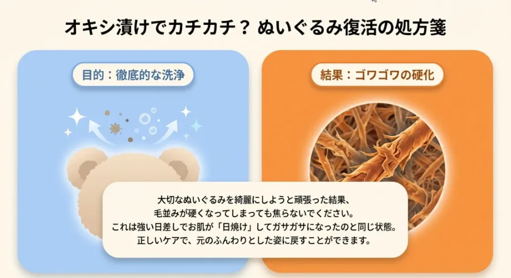 オキシで質感が変わるのは、繊維の膨潤と残留アルカリが原因です。科学の力で「中和」すれば、あの頃のふわふわな抱き心地が必ず戻りますよ。