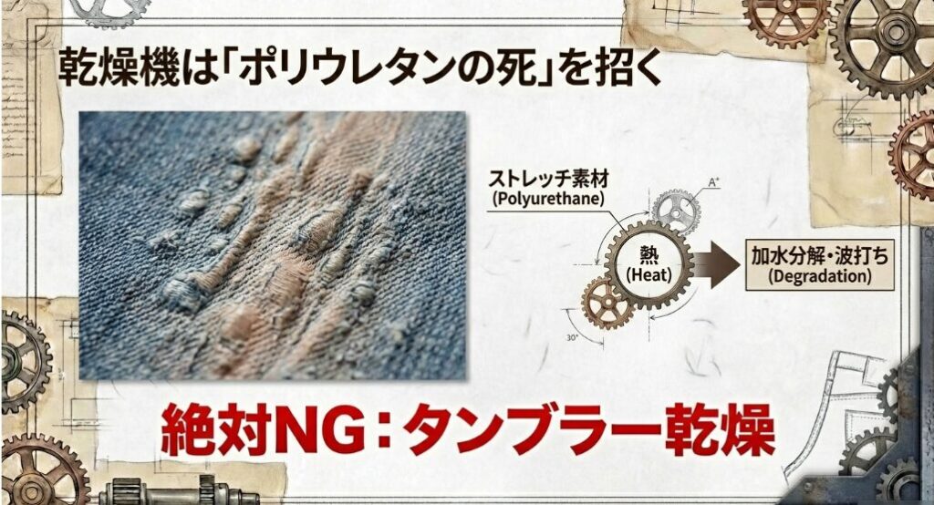 最後に、良かれと思ってやってしまいがちな「追い失敗」のリスクについてお伝えします。一番怖いのは「熱による変質」です。縮んだデニムをお湯につけて無理やり引っ張ると、綿繊維が物理的に引きちぎられたり、ストレッチ素材に含まれるポリウレタンが熱で溶けて「膝抜け」が一生戻らなくなったりします。