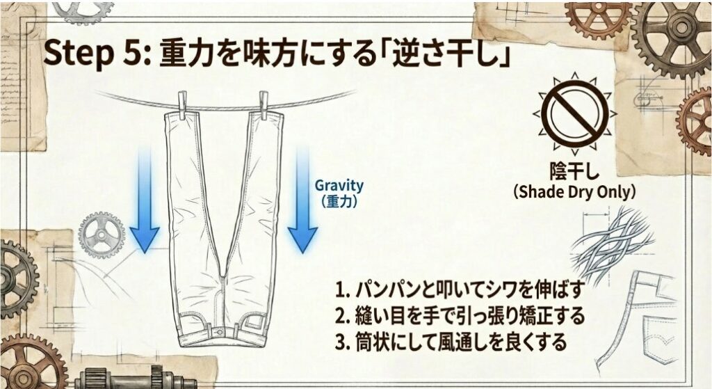 脱水が終わったらすぐに取り出し、縮みが気になる股下やウエストを、両手で均等にググーッと優しく引っ張ります。干す時は、ウエスト部分を輪っか状に広げて吊るす「筒干し」に。福井のような湿度の高い地域では、必ず下からサーキュレーターの風を当てて、半日以内に乾かしきってください。
