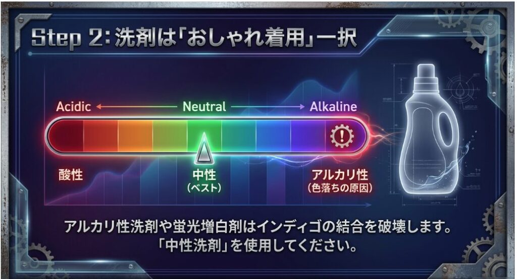 ここに「弱アルカリ性」の強力な洗剤や「お湯」を合わせると、インディゴが溶剤のように溶け出してしまいます。また、全自動洗濯機の強力な脱水は、重いデニム生地を洗濯槽に強く押し付けます。その際についた鋭い「折り目」が摩擦で削られ、あの絶望的な白いスジ(アタリ)となって定着してしまうわけです。