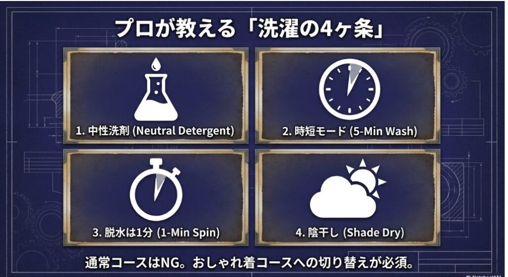私も以前、中3の次男がようやく手に入れたお気に入りの生デニムを、いつもの癖で「標準コース」でガシガシ回してしまったことがあります。洗い上がりを見た次男の、あの言葉にならない悲しそうな顔……。でも大丈夫。繊維の仕組みを理解すれば、その「絶望」は希望に変えられます。