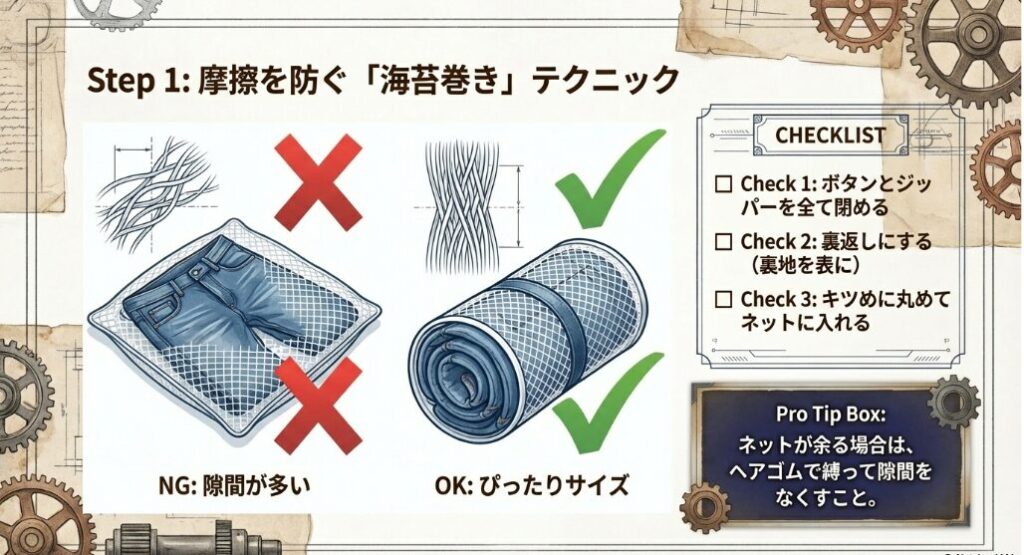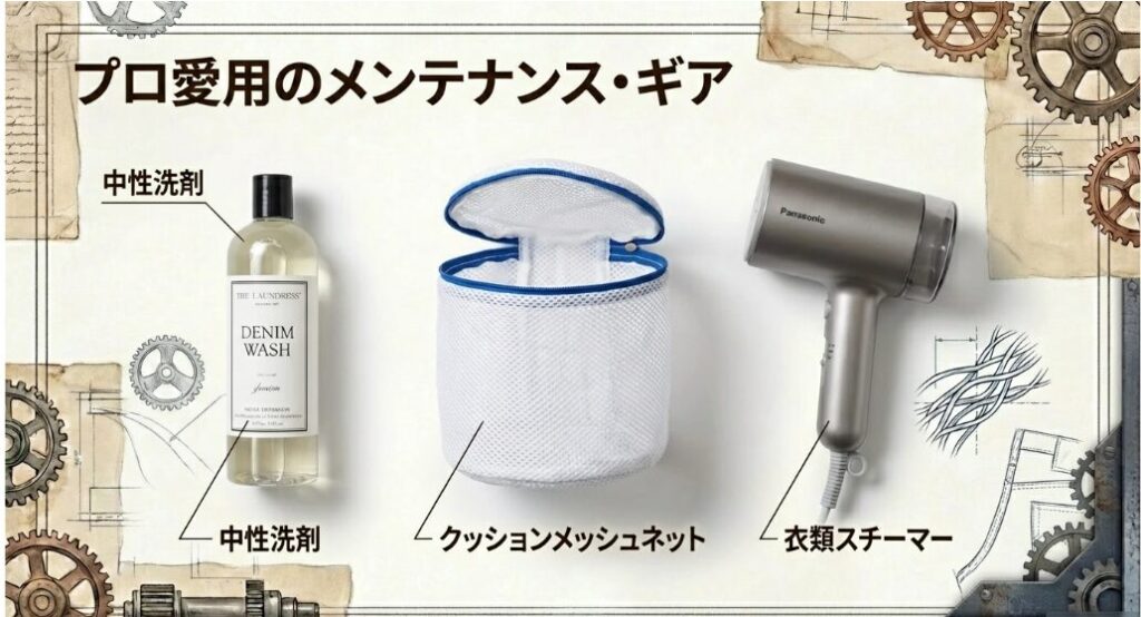 もし、洗濯機で洗う際の摩擦がどうしても怖いなら、デニム専用の洗濯ネットを1つ持っておくと安心感が違います。普通のネットよりも網目が細かく、生地の「踊り」を抑えてくれる優れものです。