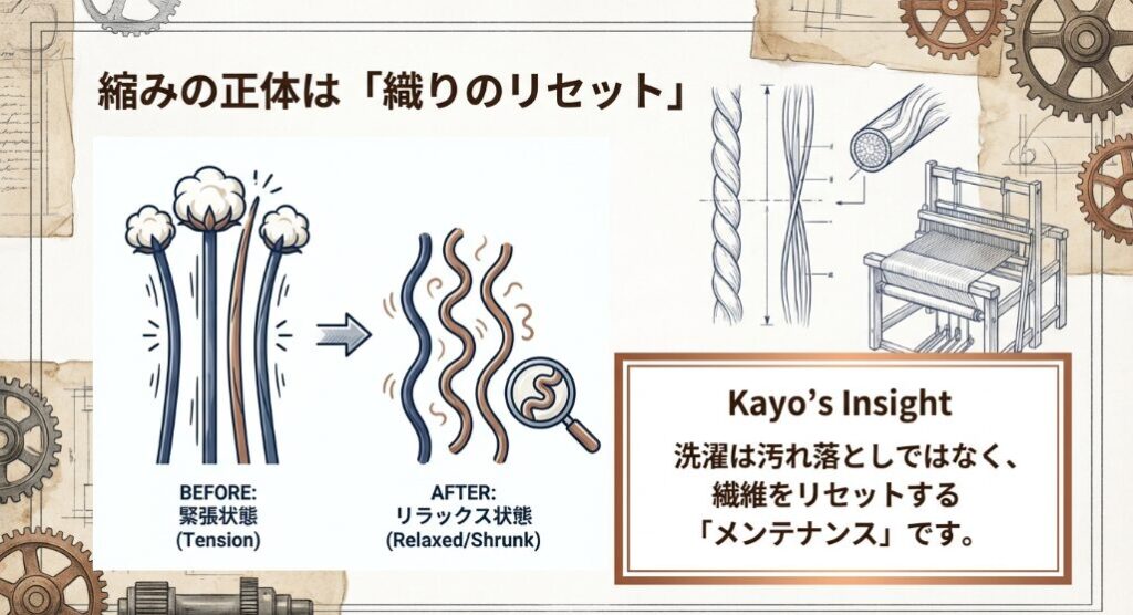 | 極端な縮み | 高温乾燥機・熱風 | 綿繊維の過乾燥による収縮 | 低(水分で復元可) |
