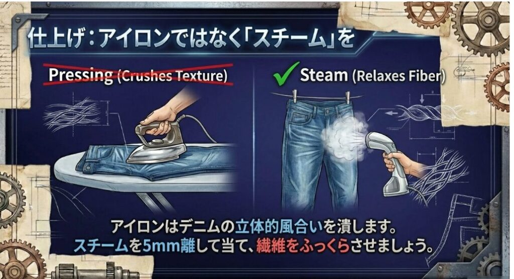 完全に乾いたら、仕上げに衣類スチーマーを使います。アイロン面を生地に当てず、5mmほど浮かせて大量のスチーム(蒸気)だけを浴びせてください。高温の水分が繊維内部に入り込むと、潰れていた綿がふっくらと立ち上がります。これで軽微なスジやゴワつきが消え、デニム本来のしなやかな風合いが蘇ります。